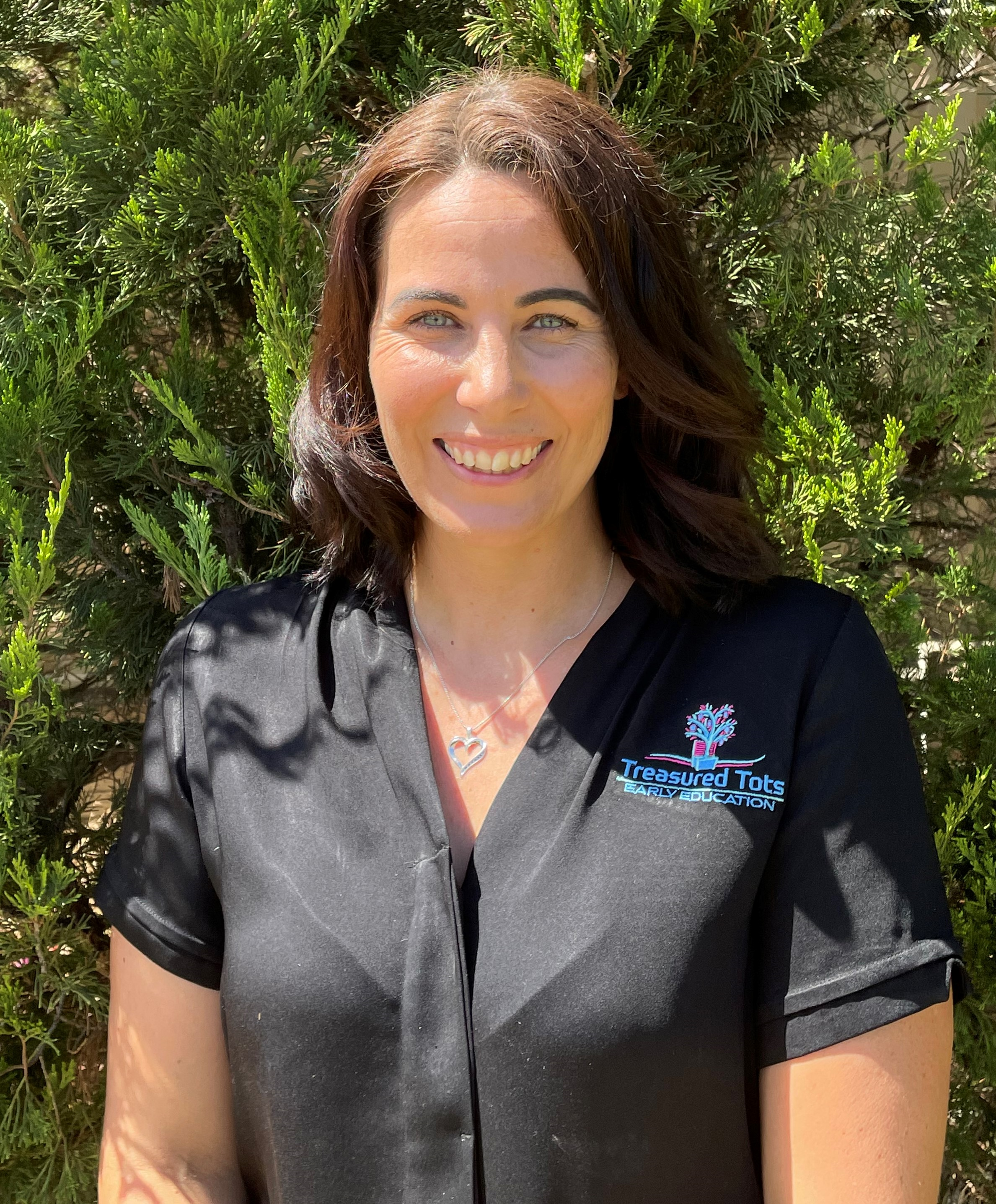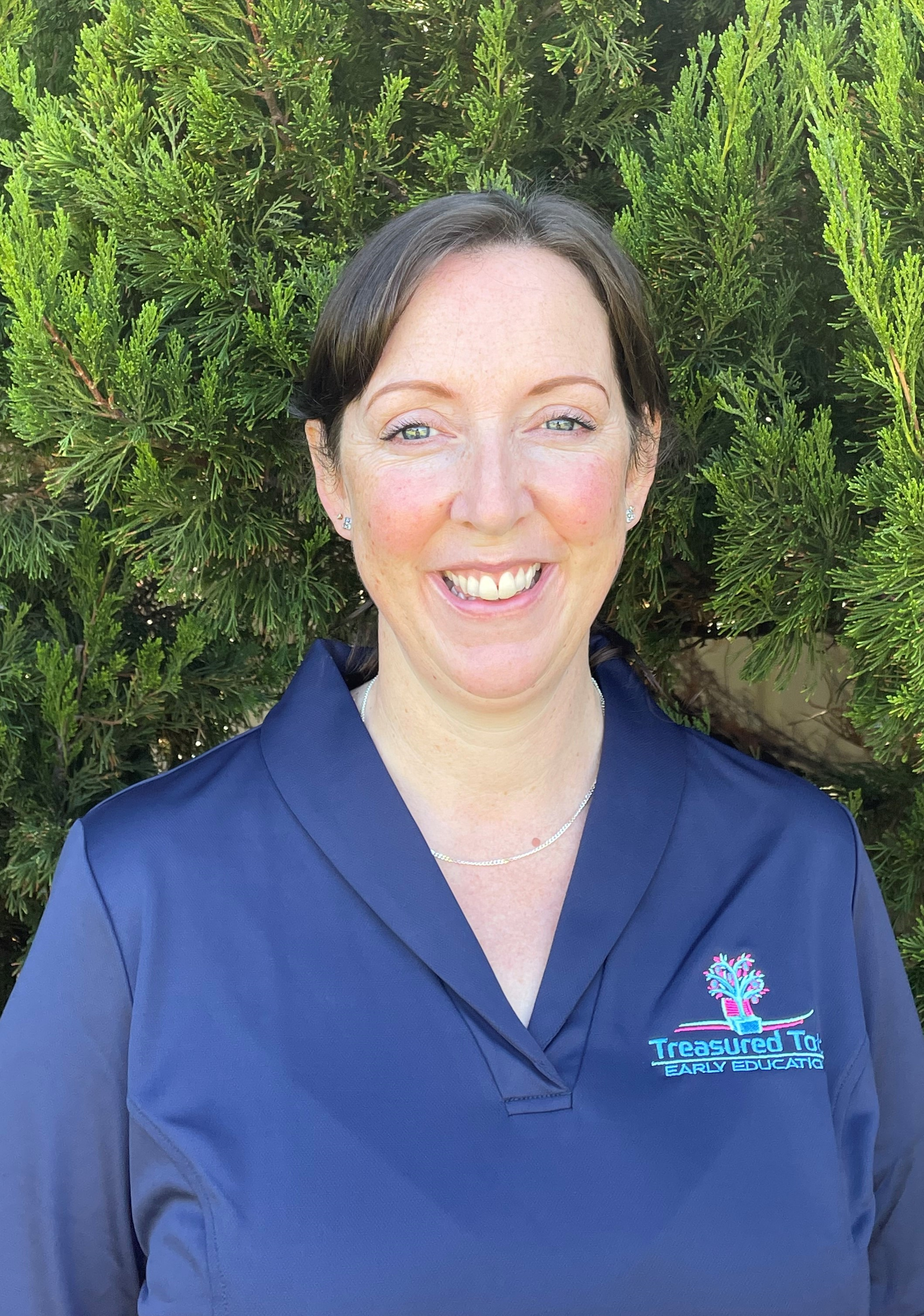 • A woman with blonde hair and blue eyes smiling outdoors in front of green bushes, wearing a dark blue polo shirt with a logo that says 'Treasured' and 'Early Ed' along with an image of a tree and a book.